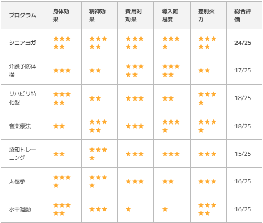 | プログラム | 身体効果 | 精神効果 | 費用対効果 | 導入難易度 | 差別火力 | 総合評価 |
